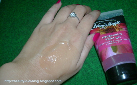 I had read a lot about Aroma Magic products over the blogs and my curiosity lead me to my local departmental store hunting for their products.I was basically looking for a scrub and had heard a lot about their mineral glow scrub, but at the store the peppermint exfol gel caught my fancy.Why?Well it seemed more suitable for my sensitive,oily skin and claimed to contain AHA,which I'm currently obsessed with(more about that in my next post).So I went ahead and bought it even though I had no prior knowledge about it(meaning I had not read about it in the blogosphere).And I was so confident I went ahead and bought the 120 ml pack.